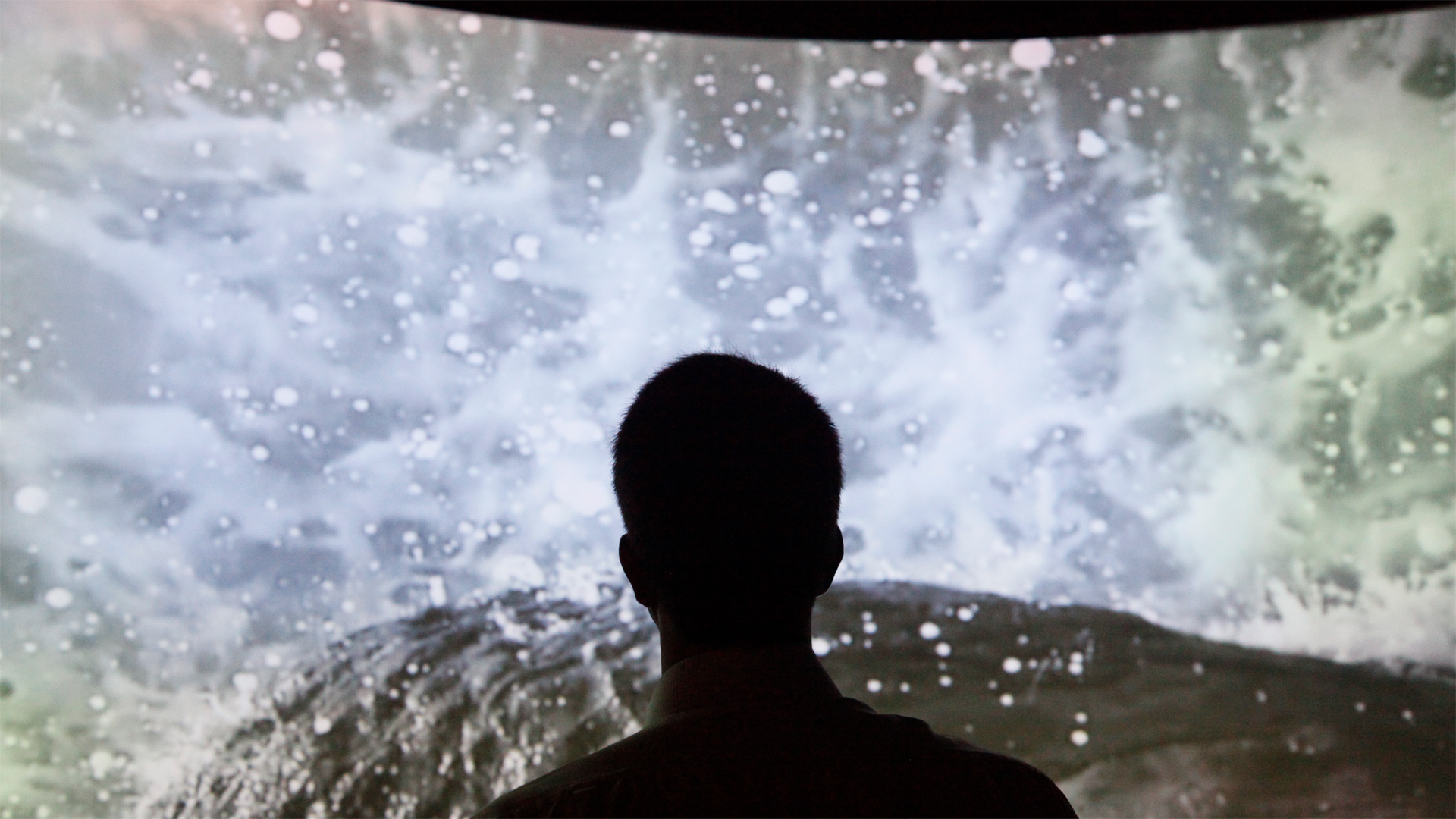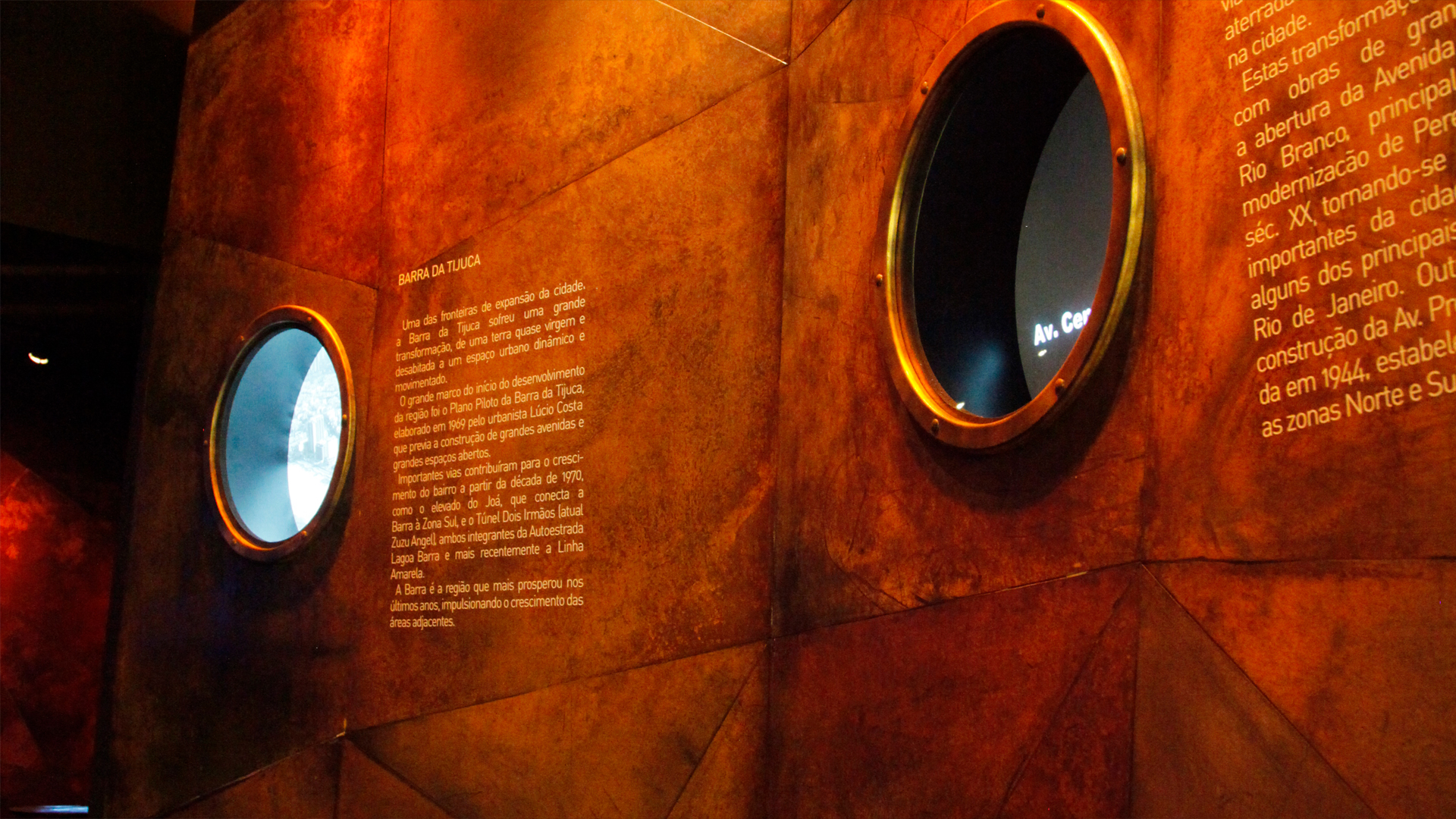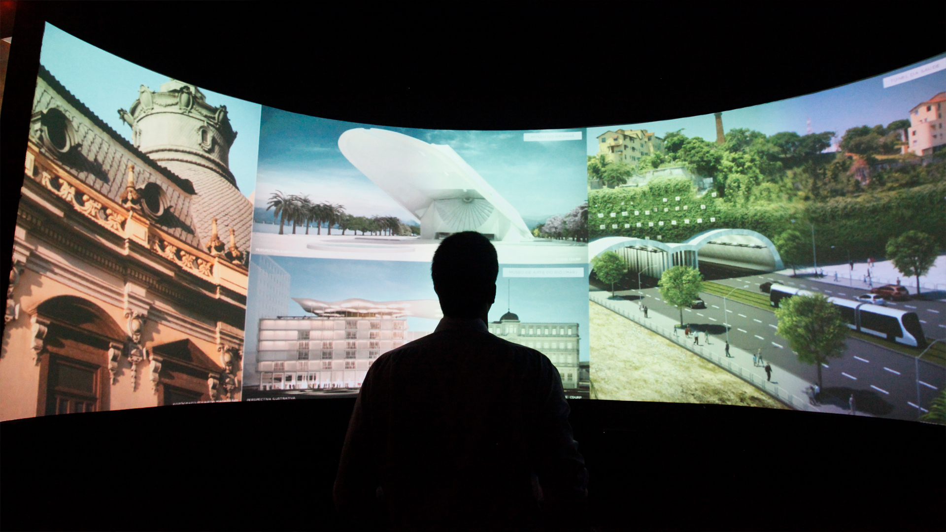 Projeção mapeada numa parede cuva e controlada por gestos. Desenvolvido para um empreendimento corporativo no porto do Rio de Janeiro
